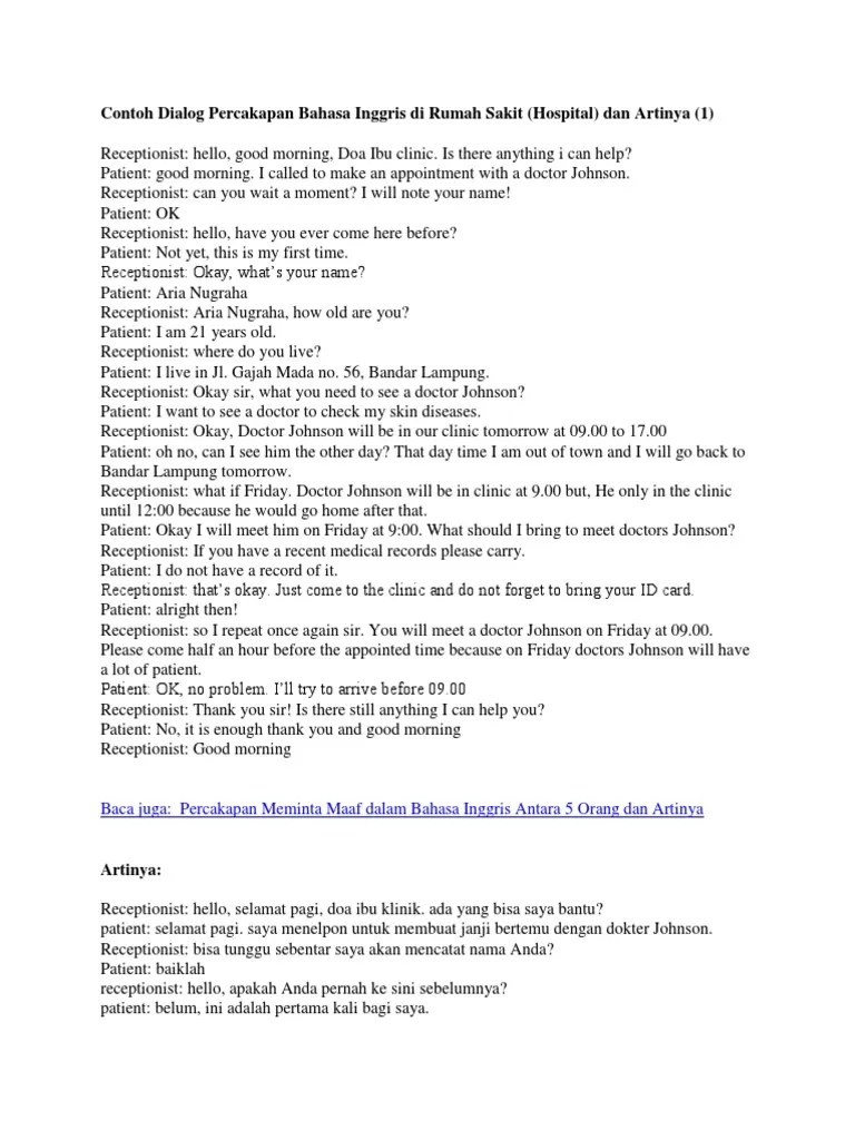 Contoh dialog simpati dalam bahasa inggris · 1. Berikut ini contoh lengkap percakapan bahasa inggris dan terjemahannya tentang perkenalan, liburan, sekolah, dsb serta tips agar lancar berbicara bahasa. Kali ini yang akan kita bahas . Anda juga akan dimudahkan dengan terjemahan . Bisa juga mengenai berbagai macam topik. Ada berbagai ungkapan salam atau greetings dalam bahasa inggris. Untuk mempelajarinya dengan lebih mudah maka akan disertakan contoh dan artinya. Banyak sekali kebutuhan komunikasi yang bisa kita lakukan, misalnya memperkenalkan diri, memohon bantuan, ngobrol, dan lain sebagainya. Ini adalah contoh dialog bahasa inggris 2 orang yang bisa anda gunakan untuk berbicara dengan siapapun itu. Supaya semakin lancar, ini dia beberapa . I am sorry to hear that. Percakapan bahasa inggris terbagi menjadi dua, yakni formal dan informal. Percakapan 2 orang tentang perkenalan.